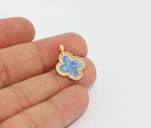 Material : BrassSize : 17x21mmColor : 24k Shiny Gold PlatedStone Color: WhiteEnamel Color: BlueQuantity : Optional