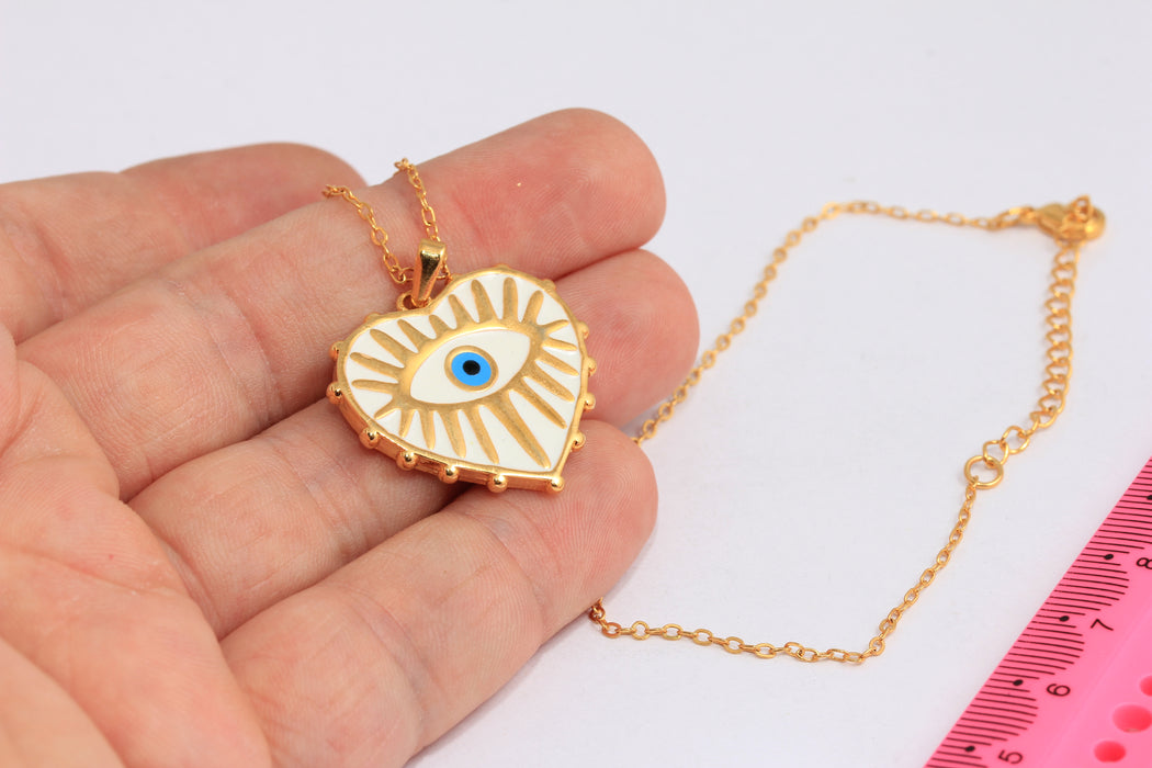 24k Shiny Gold Rolo Necklace, Ready White Evil Eye Necklace, HRN62-2