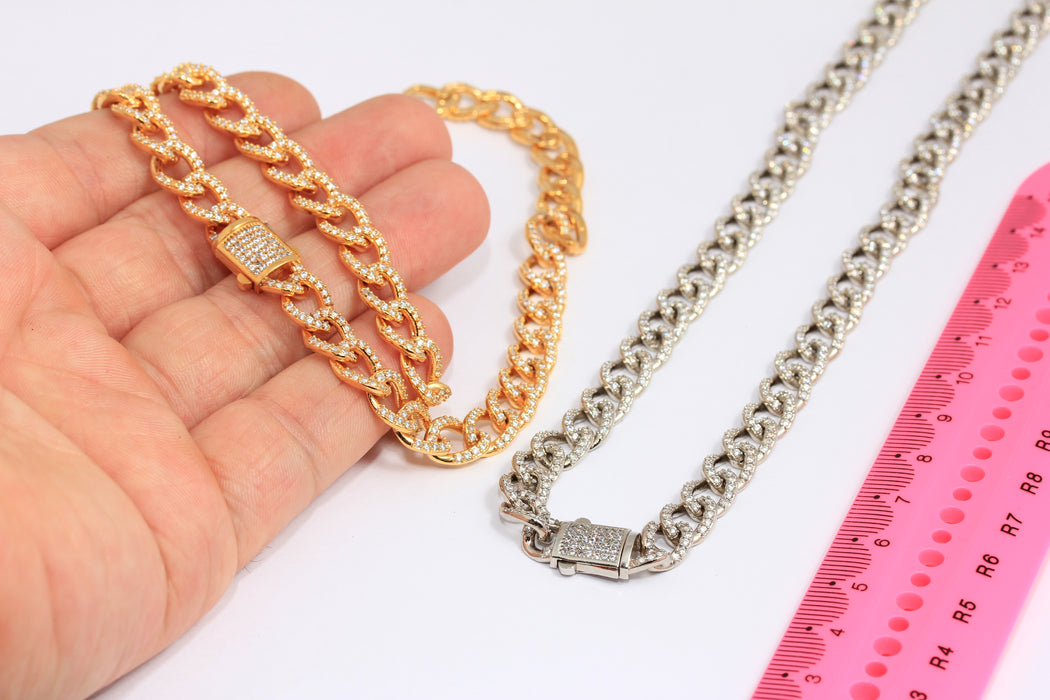 2pcs 17" 24k Shiny Gold/ Rhodium Plated Cuban Link Necklaces, CZ Necklaces, Curb Link Chain, Ready Necklaces, Cubic Zirconia, ROSE158-4