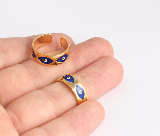 17-18mm 24k Shiny Gold Evil Eye Rings, Blue Enamel Evil Eye SLM607