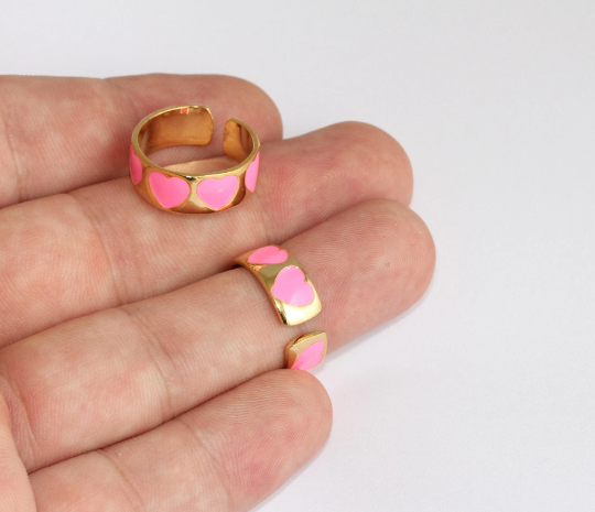 17-18mm 24k Shiny Gold Heart Rings, Pink Enamel Heart SLM86