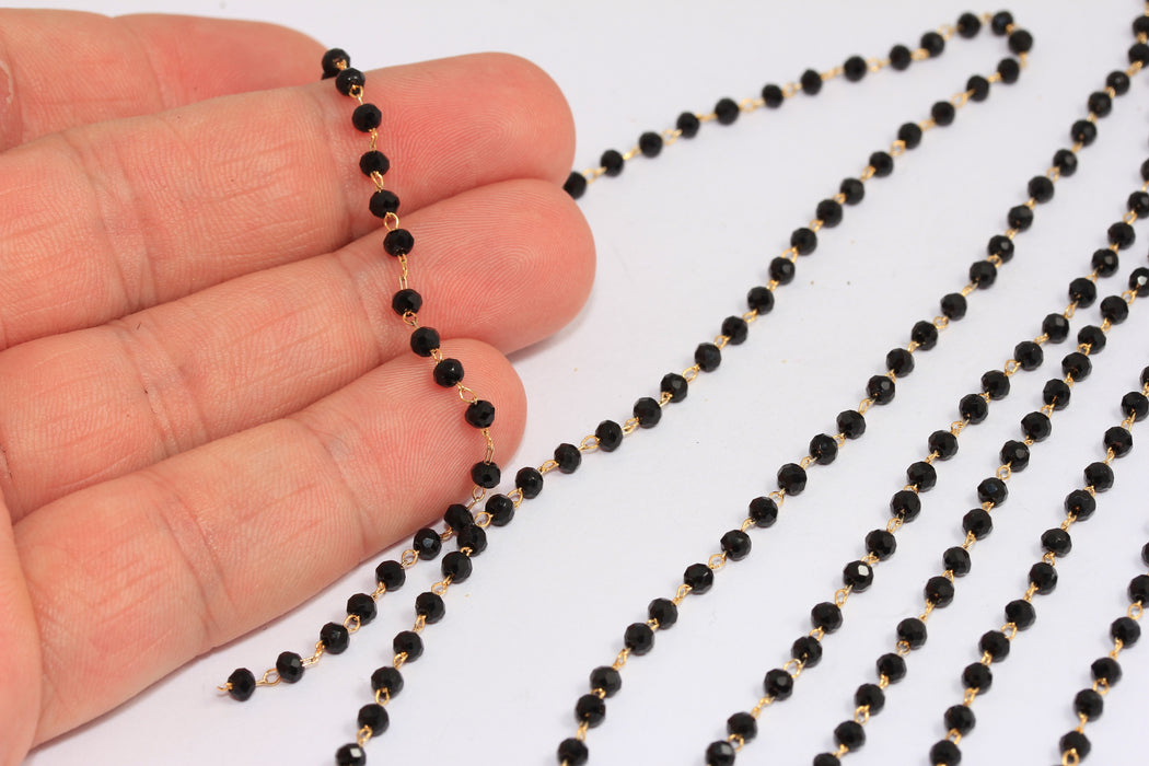 3mm 24k Shiny Gold Crystal Chains, Black Beaded Rosary Chains, BXB324