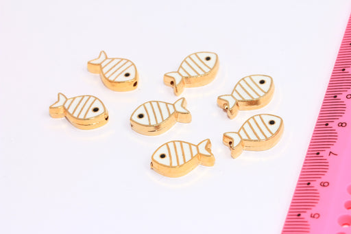 9x16mm 24k Shiny Gold Fish Beads, Fish Charms, Center Hole Fish Beads, Bracelet Beads, White Enamel Fish, XP279