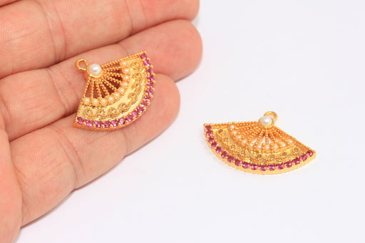20x32mm 24k Shiny Gold CZ Sector Charms, Micro Pave Ruby Stone Color Fan Pendant, XP209