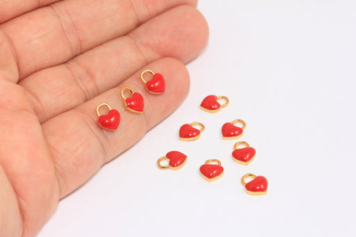 7x9mm 24k Shiny Gold Heart Beads, Red Enamel Heart Charms, BXB8-3A