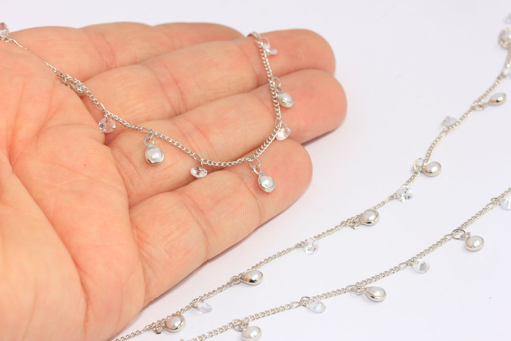 1,5mm Rhodium Plated Pearl Chain, Beaded Chain With Crystal Beads, CHK238-2