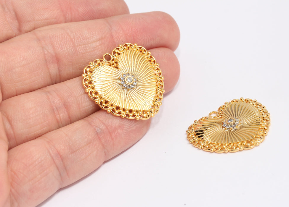 28mm 24k Shiny Gold CZ Heart Charms, Micro Pave Heart Charms, FRB143