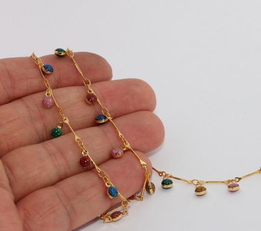 Material : BrassCrystal Size : 1x12mmColor : 24k Shiny Gold PlatedCrystal Color : Mixed ColorLength: Optional