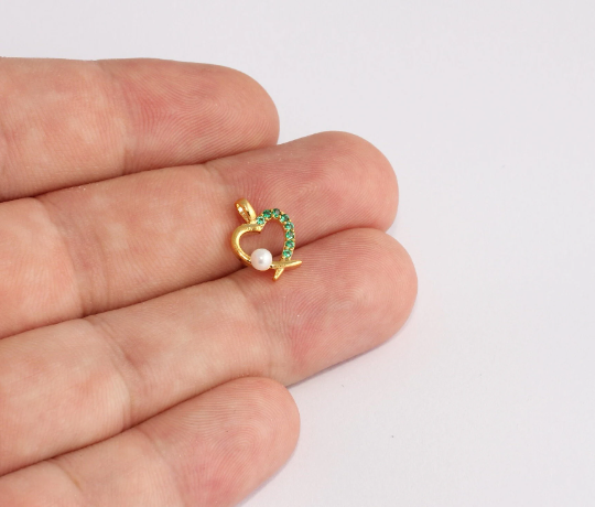 10x13mm 24k Shiny Gold Heart Charms, Green Stone, SLM225