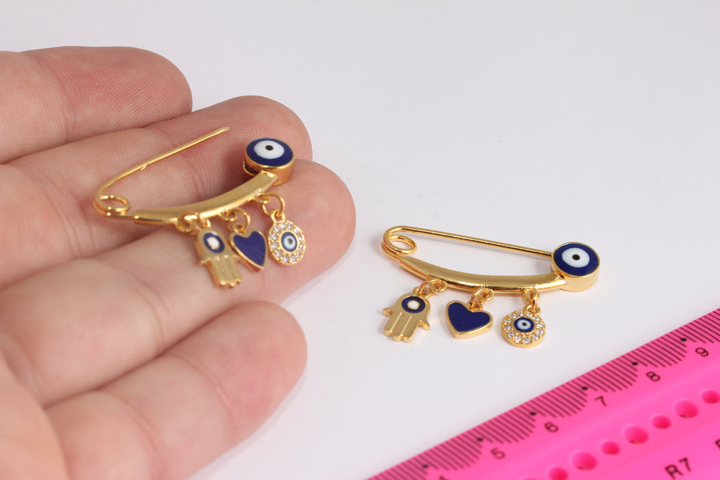 14x35mm 24k Shiny Gold Plated Evil Eye Safety Pin With Loops, Blue Evil Eye Baby Protection, Cute Evil Eye Baby Clothing Pin, MTE1403-1