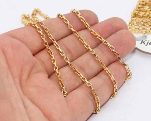 Material: Brass Width: 2,5mm Chain Thickness : 0.5mm Color : 24k Shiny Gold Plated Length : Optional Quantity : Optional