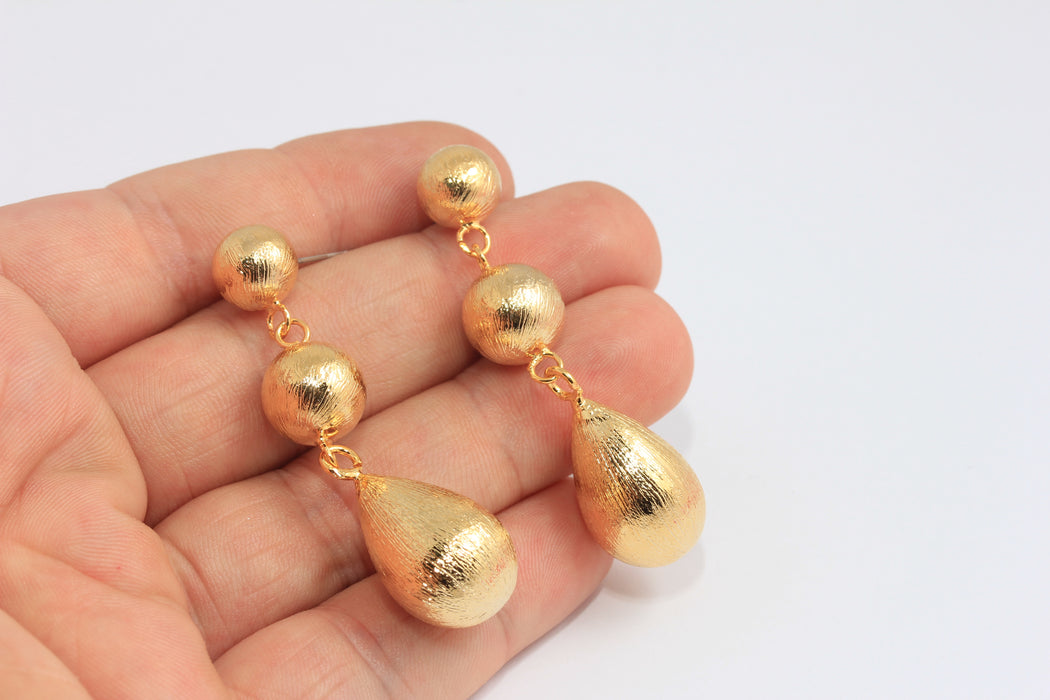 10mm 24k Shiny Gold Ball Stud Earrings, Long Drop Ball Charm Earrings, MTE10