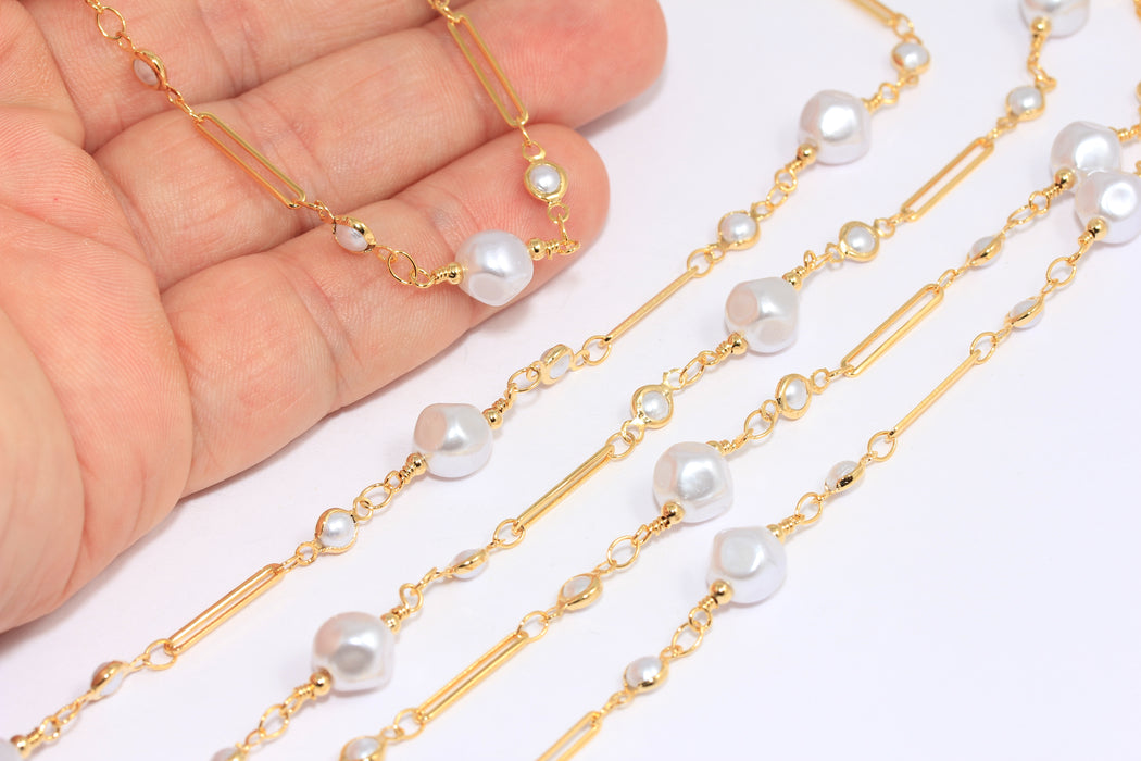 8mm 24k Shiny Gold Beaded Chain, Rosary Style Pearl Chains, Chain With White Pearl Beads, BXB356-7