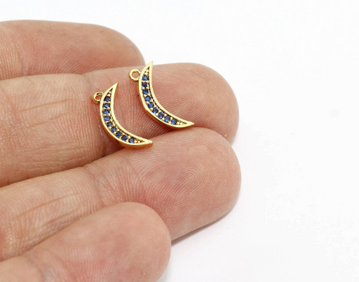 6x13mm 24k Shiny Gold CZ Moon Charms, Micro Pave Blue Stone Moon, ZRCN497
