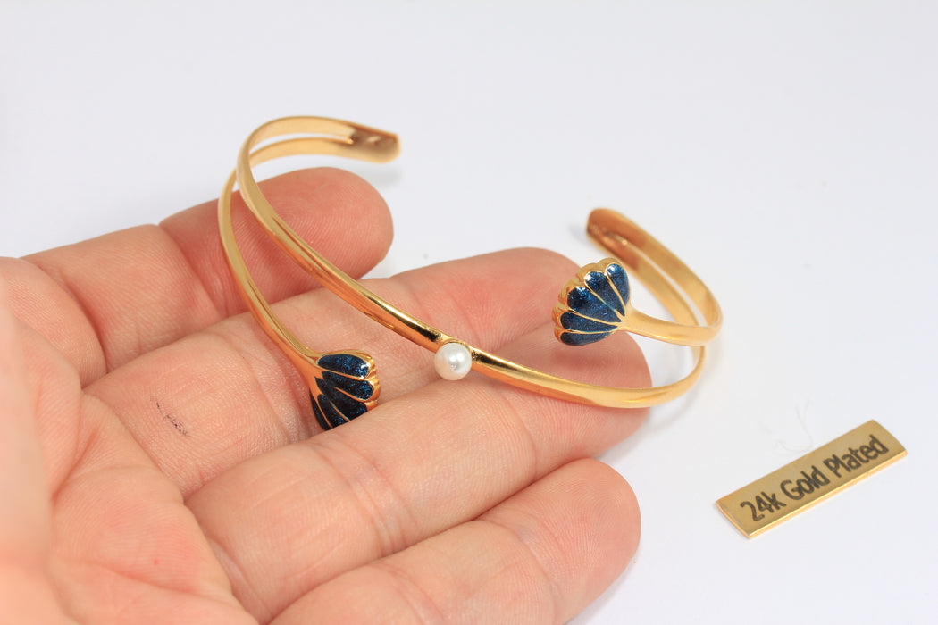 24k Shiny Gold Shell Bracelet Cuff, Dark Blue Enamel Shell Bracelet With Sea Pearl, Triple Wire Bracelet, CHK588-10