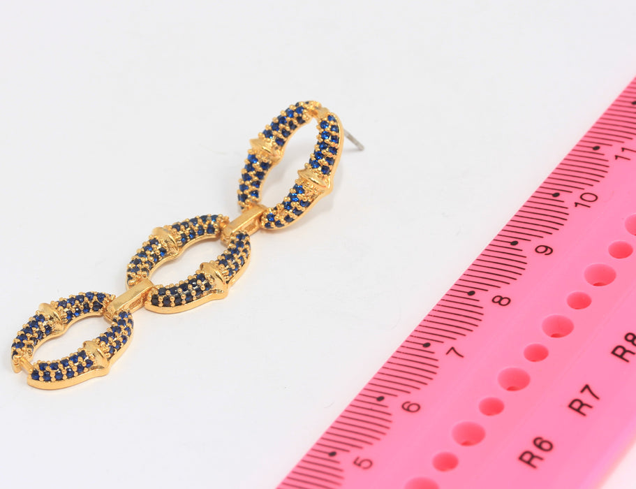 13x55mm 24k Shiny Gold Drop Earrings, Micro Pave Blue Stone Earrings, SLM743