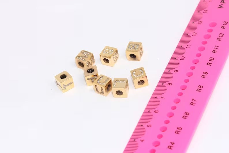 8x8mm 24k Shiny Gold Cz Letter Beads, Cube Letter, Zircon, HRF38-1