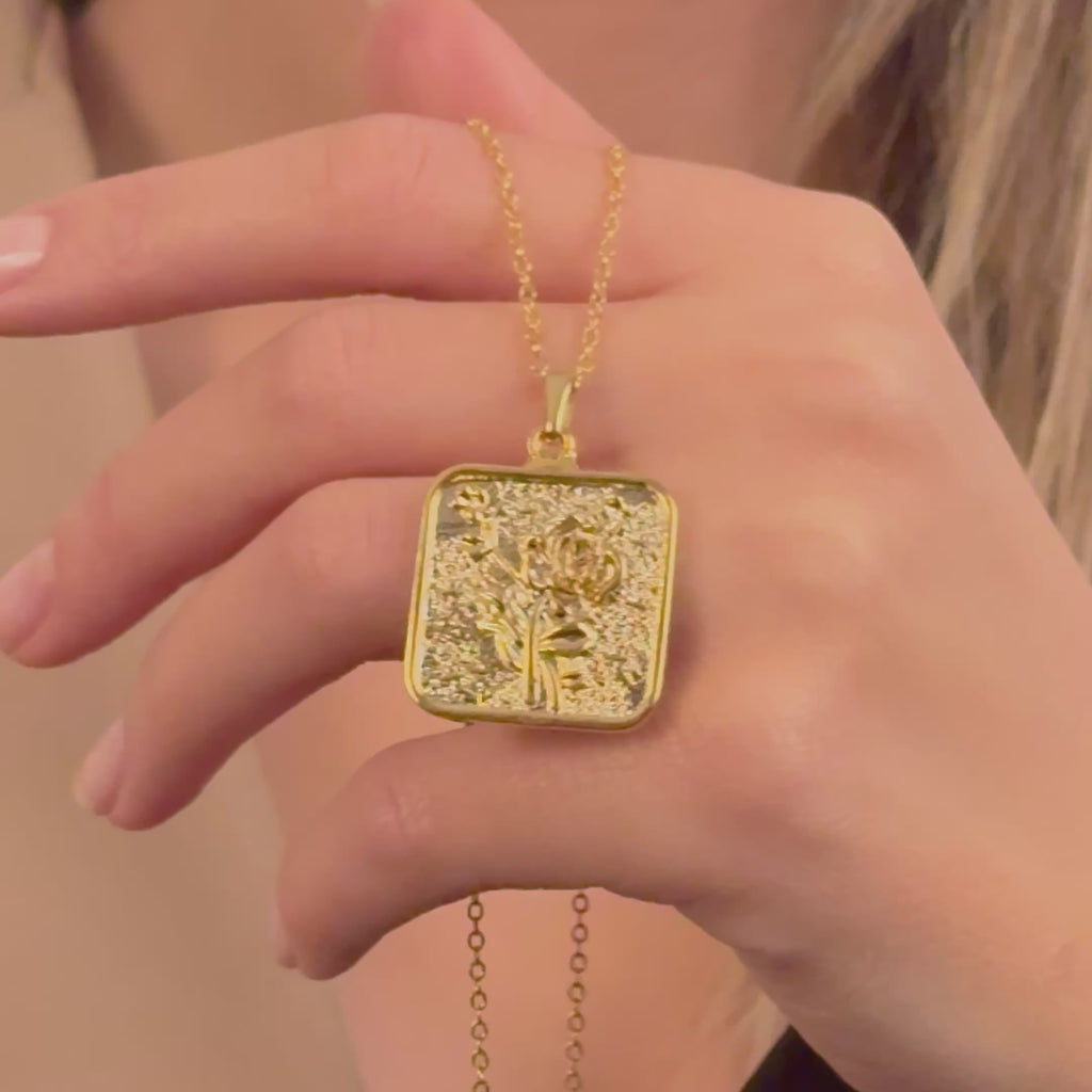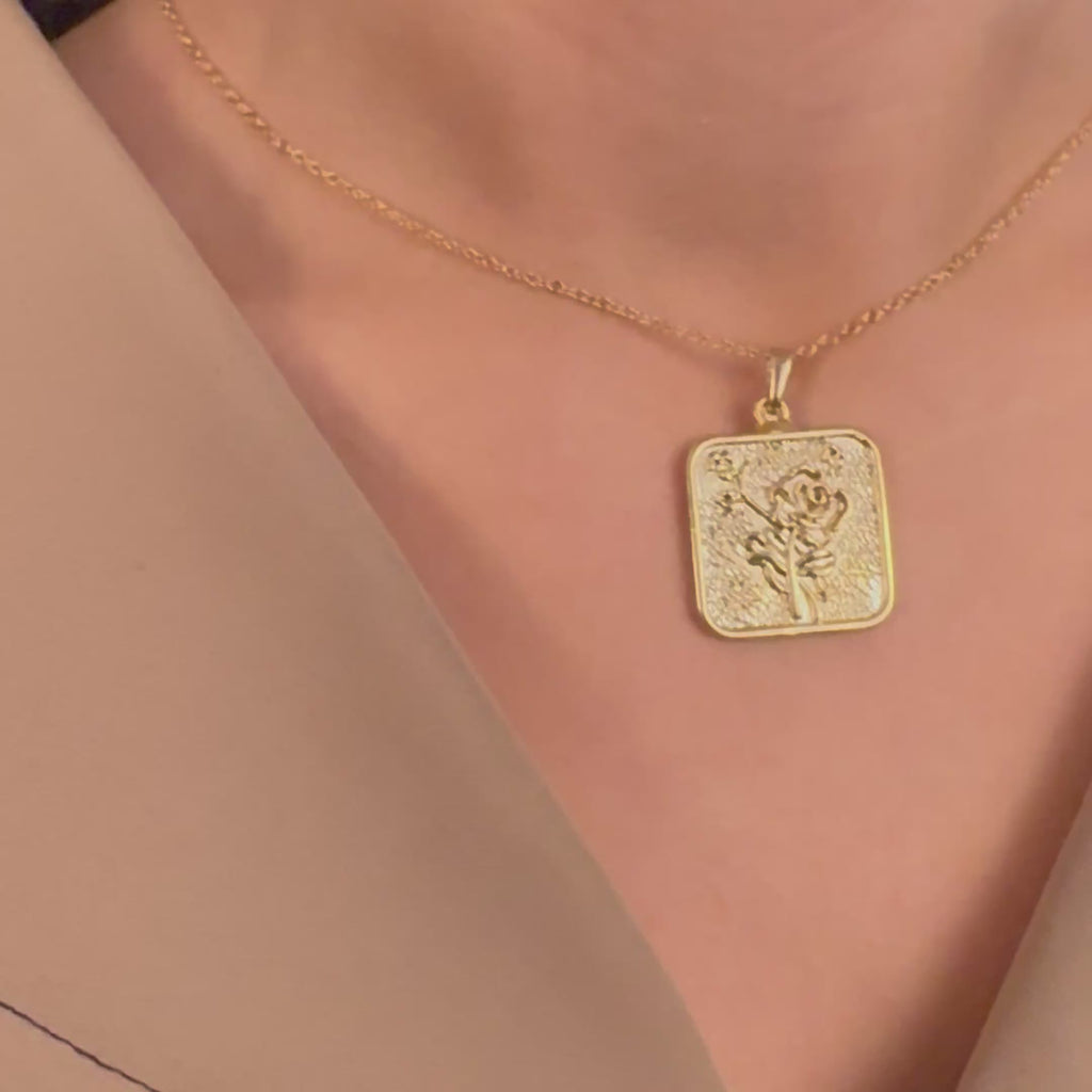 17'' +2'' 24k Shiny Gold Flower Ready Necklace, Square Rose Flower Medallion Charm Necklace, DC192-20