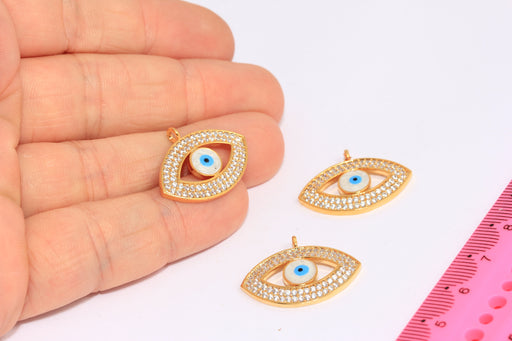 Ciondoli con zirconi cubici in oro lucido 24k da 20x26 mm, occhio diabolico smaltato con micro pavé, SLM36