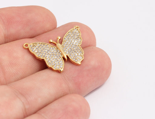 Ciondoli a farfalla in oro lucido 24k con zirconi cubici, 20x28 mm, micro pavé, KDR77