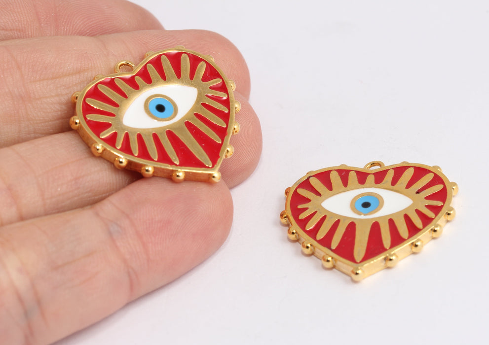 Medaglione a forma di cuore in oro lucido 24k, 27x28 mm, malocchio in smalto rosso, XP482