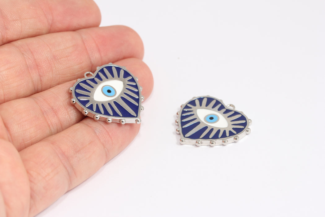 Ciondolo a forma di cuore con occhio maligno in argento 27x28 mm, smalto blu navy, SLM49