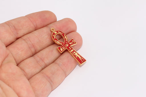 Ciondolo Ankh in oro lucido 24k, 19x42 mm, smalto rosso, oro XP22