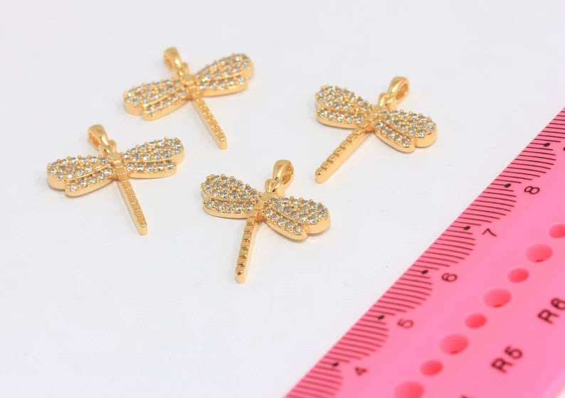 Ciondoli in oro lucido 24k da 19x23 mm, libellula con micro pavé, perline a forma di libellula in zirconia cubica, ciondoli per collana con micro pavé, ciondolo a farfalla in zirconia cubica, SLM765