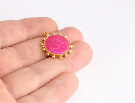 Malzeme : Pirinç Boyut : 22mm Renk : 24 ayar Parlak Altın Kaplama Mine Rengi: Pembe Miktar : İsteğe bağlı
