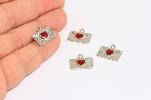 9x16mm Rodyum Kaplama Zarf Harf Takıları, Kırmızı Kalpli Zarf Kolye, CHK315-1
