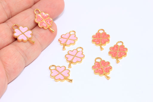 13x22mm 24 ayar Parlak Altın Yonca Tılsımları, Pembe Emaye Çiçek Boncukları,