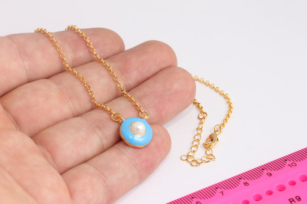 18'' 24 Ayar Parlak Altın İnci Kolye, Hazır Kolye, Mavi Emaye Yuvarlak Kolye Ucu, İnci Kolye Ucu, Zarif Kolye, BXB421-3
