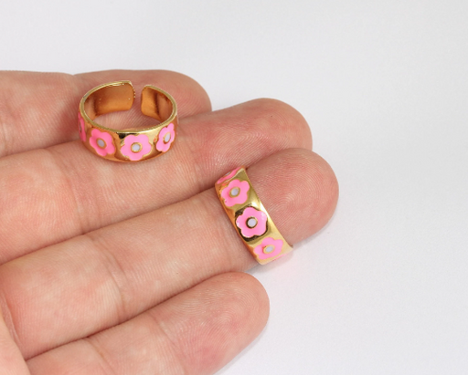 17-18 mm 24 Ayar Parlak Altın Çiçek Yüzükler, Beyaz Emaye Çiçek Yüzük, BRT277