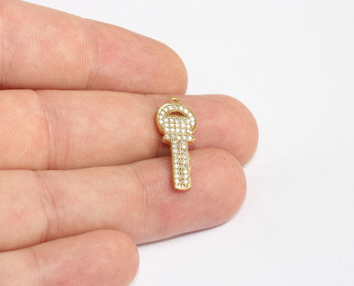 10x25mm 24 Ayar Parlak Altın Anahtar Süsü, Mikro Döşeme Anahtarı, Zirkonyum MLS748