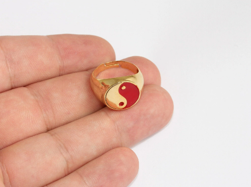 17-18 mm 24 Ayar Parlak Altın Yüzükler, Kırmızı Emaye Yin Yang Yüzükler, SLM48