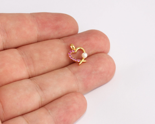10x13mm 24 Ayar Parlak Altın Kalp Takılar, Pembe Taşlı Mikro, SLM192