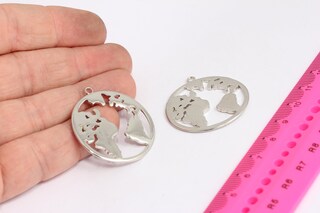 34 mm Gümüş Kaplama Dünya Haritası Kolye, Küre Kolye, MTE594