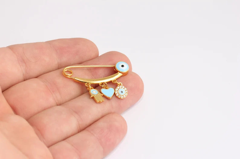 14x35mm 24 Ayar Parlak Altın Mavi Nazar Boncuğu Bebek Koruması, Emaye El, Emaye Kalp, Sevimli Nazar Boncuğu Bebek Giyim İğnesi, KDR40-3
