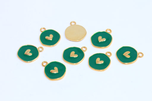 13,5 mm 24 ayar Parlak Altın Mine Kalp Charm, Yeşil Mine Renkli Kalp Madeni Boncuklar, BRT217