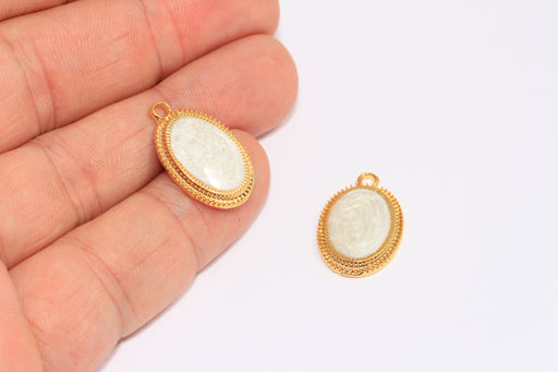 Malzeme : Pirinç Boyut : 14x19mm Renk : 24 ayar Parlak Altın Kaplama Mine Rengi: İnci Beyazı Miktar : İsteğe bağlı