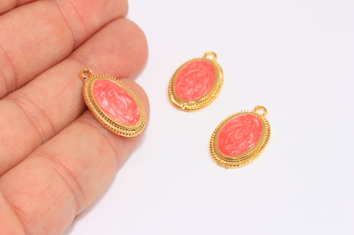 14x19mm 24 Ayar Parlak Altın Madalyon, Pembe Mine Renkli Madalyon Kolye Ucu, Vintage Kolye Uçları, CHK91-8C