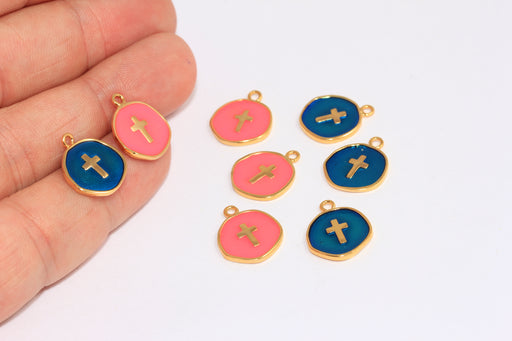 13,5 mm 24 ayar parlak altın mineli haç tılsımı, isteğe bağlı renkli mineli haç kolye, haçlı madeni para boncukları,