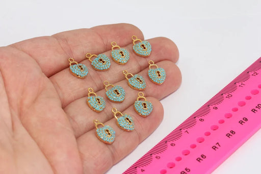 9x14mm 24 Ayar Parlak Altın Kalp Kilitli Charm, Kübik Zirkonya, Asma Kilit, Mikro Döşeme, ZRCN514
